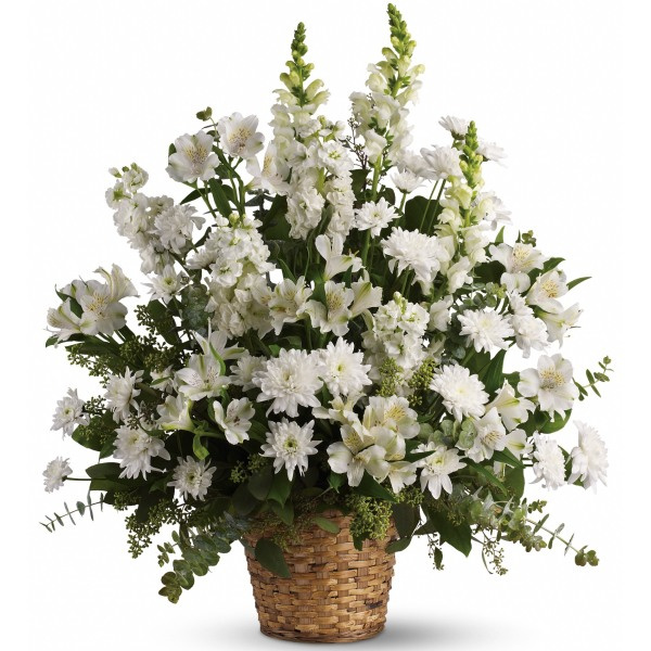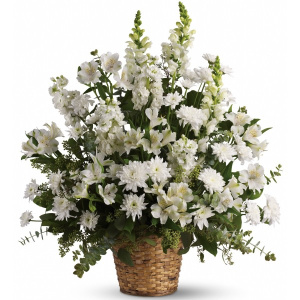 White roses and white lilies in a beautiful basket is a gift of caring that brings an air of serenity to the memorial service. Later, it will be a comfort to the family at home.