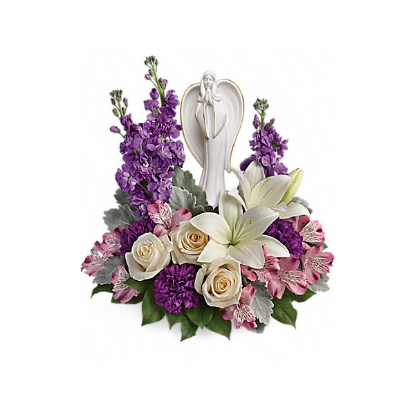 Show them they're in your heart with this magnificent display of roses, lilies and alstroemeria, gracefully surrounding a timeless angel sculpture keepsake. Beautifully fragrant, it's a tribute that will warm their hearts forever.