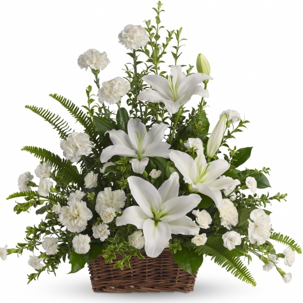 • Gorgeous flowers such as white lilies, carnations and miniature carnations mix with vibrant greens in a large basket. Simply stunning.