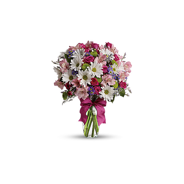 Pretty Please is a flower bouquet with a lovely mix of fresh flowers in breezy shades of pink, white, lavender and more at a wonderfully reasonable price, all tied up with a big pink bow.