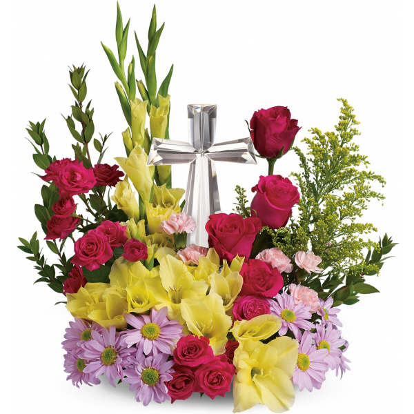 An elegant display of faith and divine peace, this beautiful arrangement will comfort the bereaved in a truly thoughtful and respectful way. An exquisite crystal cross is surrounded by radiant flowers. It is sure to be appreciated and always remembered.