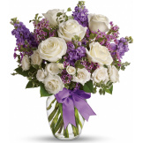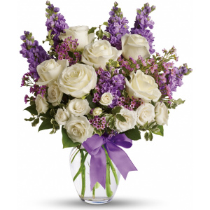 As enchanting as coming across a hidden cottage in the countryside! Lush white roses and purple stock mix with delicate lavender waxflower and green pitta negra for an elegant English garden look. The decorative bouquet is finished with a pretty satin ribbon.