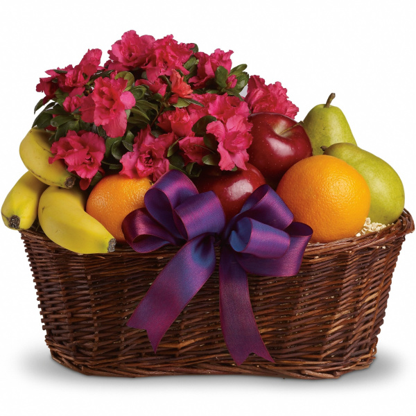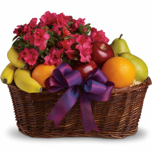 Fruit meets flowers in this delicious arrangement! Brightened by a potted azalea plant, this fruit gift basket is a yummy choice packed with apples, bananas, pears and oranges. Hand-delivered by a florist, the Fruits and Blooms Basket is a delicious and comforting way to show how much you care.