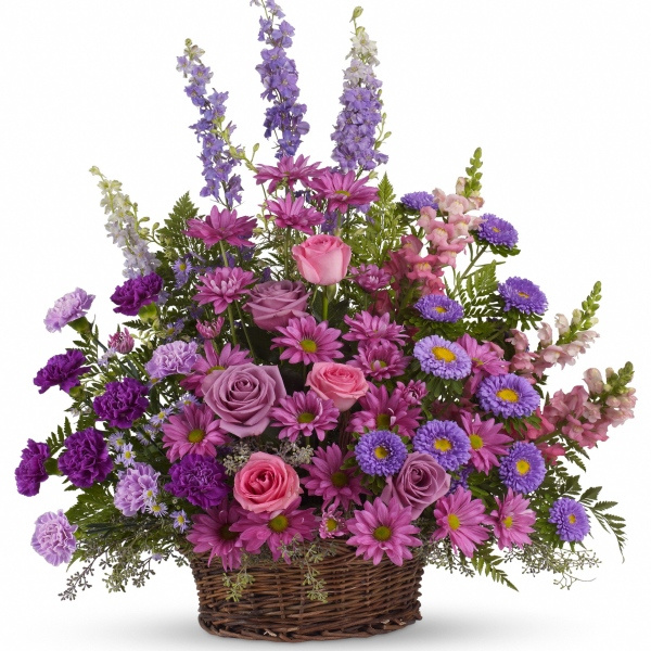 Soothing lavender, respectful purple and compassionate pinks are combined beautifully in this basket overflowing with pretty flowers, sincerity and sympathy. A lovely way to share your thoughts and pay tribute to someone special.