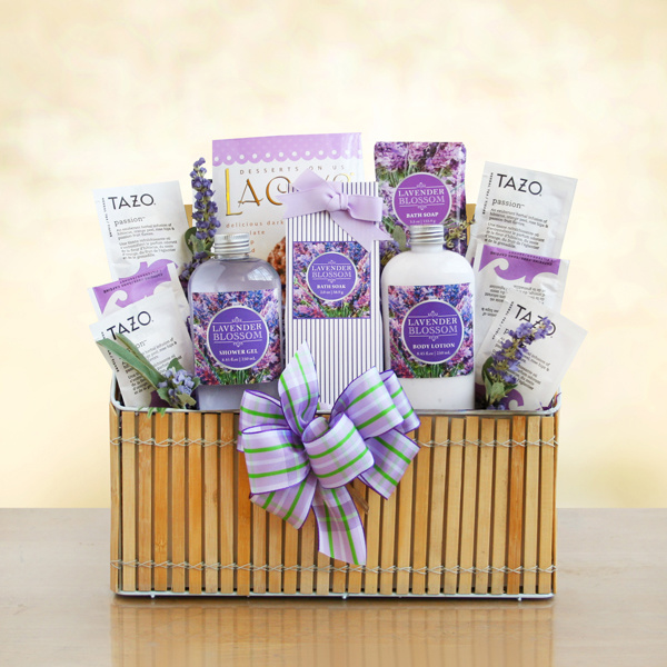 This special gift includes: Tazo Passion tea, lavender shower gel, soothing lavender body lotion, a luxurious lavender bath bar, and Lacey's toffee cookies.
