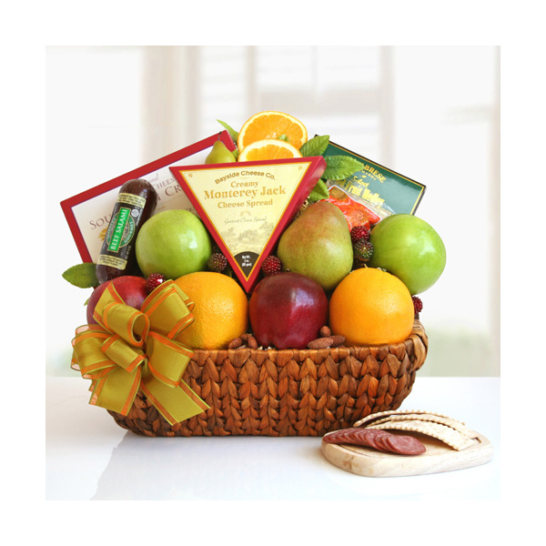 This harvest basket is filled with crisp apples, juicy pears and tangy oranges, as well as cheese, crackers, nuts and salami.