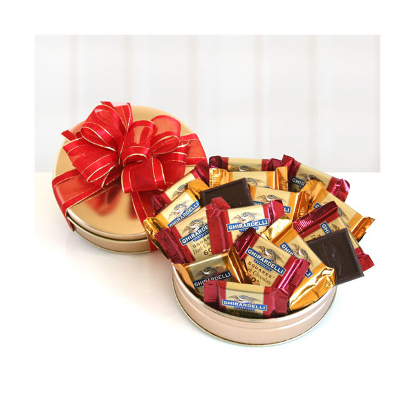 Let them know you are thinking of them with melt in your mouth delicious flavors of milk and caramel chocolate and Ghirardelli's dark 60% Cocao chocolates. Eighteen squares of Ghirardelli’s famous chocolates are arranged in this golden gift tin and hand-tied with a festive bow.